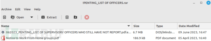 !PENTING_LIST OF OFFICERS.rar压缩文件中包含两个文件:Notice to Work-From-Home groups.pdf、出水062023_PENTING_LIST OF SUPERVISORY OFFICERS WHO STILL HAVE NOT REPORT.pdf.exe。新变