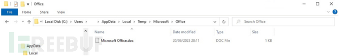 该文件被存入 C:\Users\<user>\AppData\Local\Temp\Microsoft\Office并打开,这也是一个诱饵文件。某些情况下,文件会被填充内容,但分析人员在分析时发现的样本文件多为空。