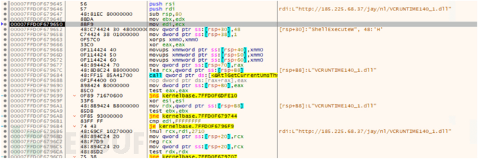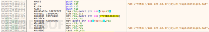 该样本文件的反汇编分析十分困难,其主要目的是通过 hXXp://185[.]225[.]68[.]37/jay/nl/35g3498734gkb.dat获取文件 35g3498734gkb.dat。
