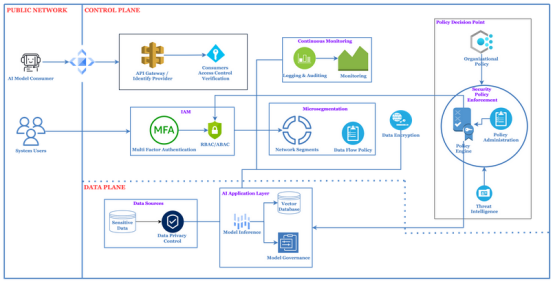 1.在每个接入点验证身份为访问人工智能资源的用户和机器实施多因素身份验证(MFA)。使用基于角色的访问控制(RBAC)或基于属性的访问控制(ABAC)来限制对敏感数据集和模型的访问。2.最低访问权限确保用户、应用程序和设备具有执行其功能所需的最低访问权限。根据时间、地点、异常行为等场景动态调整权限。3.持续监控和验证对数据流、API使用情况和模型交互进行实时监控。使用行为分析来检测异常活动,例如模型泄漏尝试。4.确保整个生命周期的安全在人工智能管道中对静止、传输和处理过程中的数据进行加密。在集成前验证和保护第三方数据集和预训练模型。5.微分段隔离人工智能系统的组件(例如训练环境、推理引擎),以在发生泄露时限制横向移动。