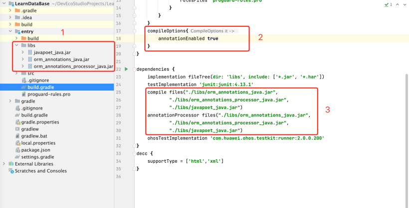 查看“orm_annotations_java.jar”、“orm_annotations_processor_java.jar” 、“javapoet_java.jar”这3个jar包在HUAWEI SDK中的Sdk/java/x.x.x.xx/build-tools/lib/目录,并将目录的这三个jar包导进来。