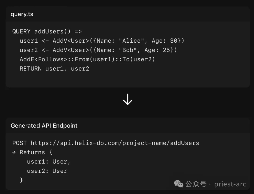 复制N::User { name: String, age: U32, email: String, created_at: I32, updated_at: I32, } N::Post { content: String, created_at: I32, updated_at: I32, } E::Follows { From: User, To: User, Properties: { since: I32, } } E::Created { From: User, To: Post, Properties: { created_at: I32, } }1.2.3.4.5.6.7.8.9.10.11.12.13.14.15.16.17.18.19.20.21.22.23.24.25.26.27.28.29.30.31.32.上述代码段用于创建或更新 HelixDB 数据库模式的脚本片段(例如保存在 schema.hx 文件中)。它使用了 HelixDB 特定的一种模式定义语言,通过清晰的语法来声明不同类型的节点(Nodes)和关系(Edges)。