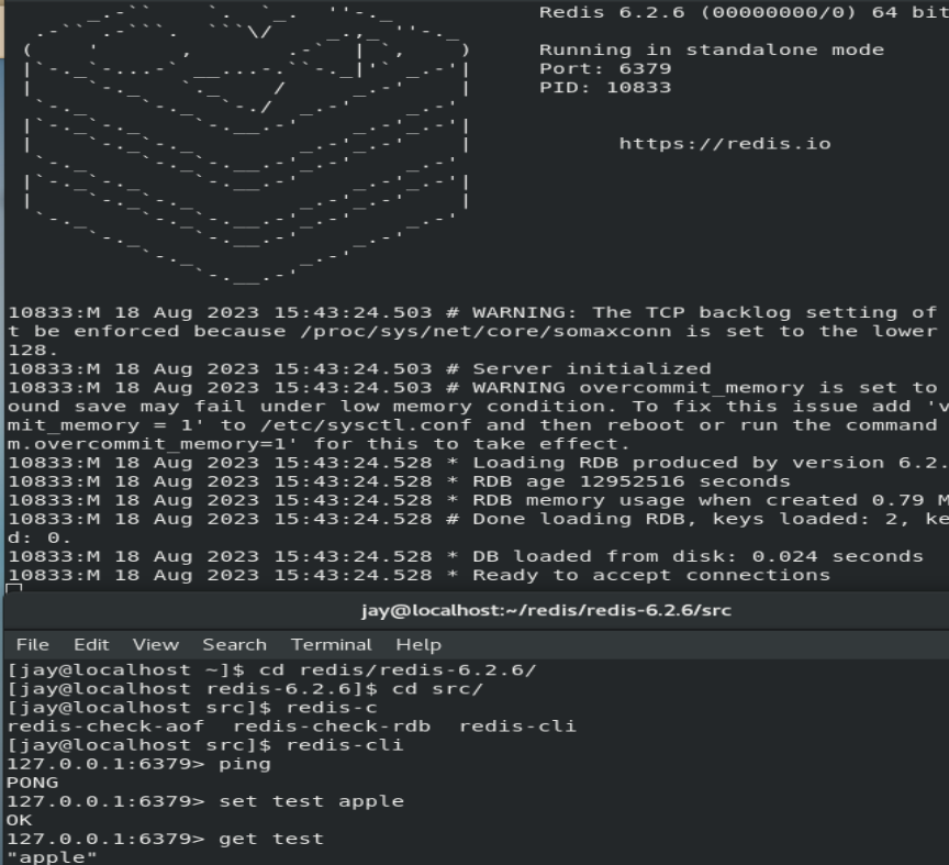 复制% wget http://download.redis.io/releases/redis-6.2.6.tar.gz % tar -zxvf redis-6.2.6.tar.gz -C /home/jay/redis/redis-6.2.6/ && rm -rf redis-6.2.6.tar.gz % cd /home/jay/redis/redis-6.2.6/ % make % make install # 启动Redis % cd src % ./redis-server # 验证 % cd src % ./redis-cli1.2.3.4.5.6.7.8.9.10.11.