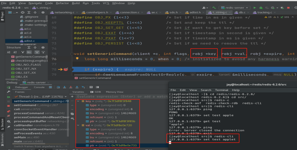 使用Clion建立C工程,并导入源代码,确保GCC9是对应的编译环境,以调试模式启动“redis-server”模块,使用“redis-cli”客户端连接服务端,b2b供应网设置断点,键入相应的命令进行调试。