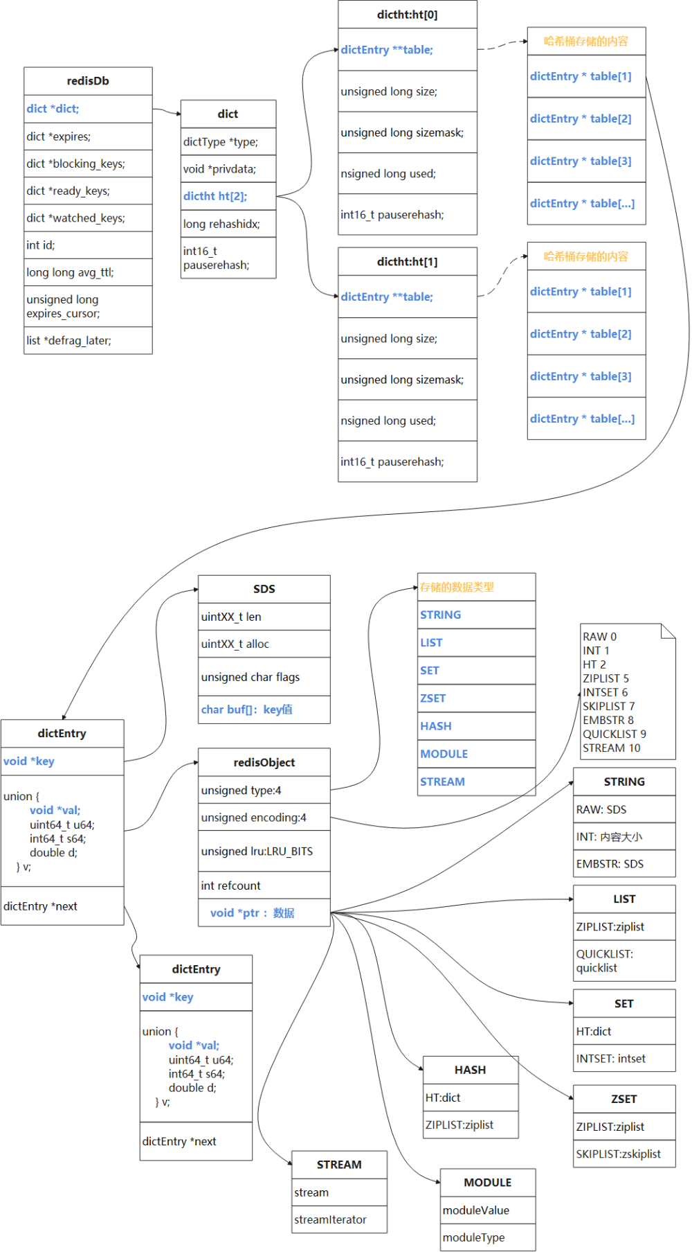 首先从宏观层面了解数据库的结构及组织关系。redisDB,dict,dictht,dictEntry,
