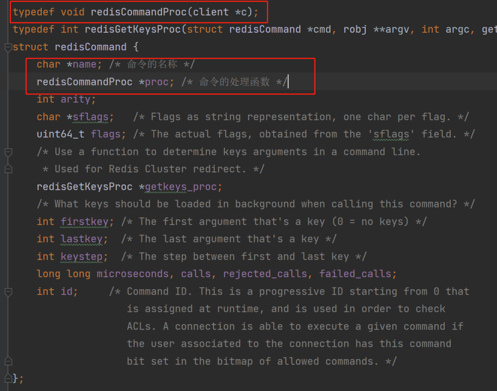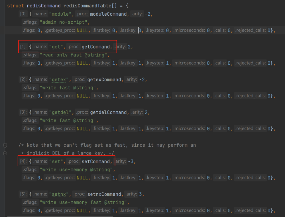 所有的redis命令定义在“redisCommandTable”数组中,类型为"redisCommand",通过函数指针的方式调用。例如下图中的Get和Set命令。
