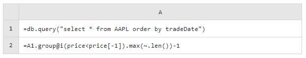 复制select max(continuousDays)-1from (select count(*) continuousDaysfrom (select sum(changeSign) over(order by tradeDate) unRiseDaysfrom (select tradeDate,