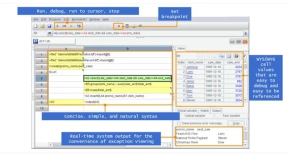 SPL 还提供了简洁易用的 IDE 环境,在 IDE 中不仅可以很方便编码调试,过程计算的每步计算结果都可以实时查看,网格式编码代码天然整齐,通过格子名称引用中间计算结果无需定义变量,十分方便。