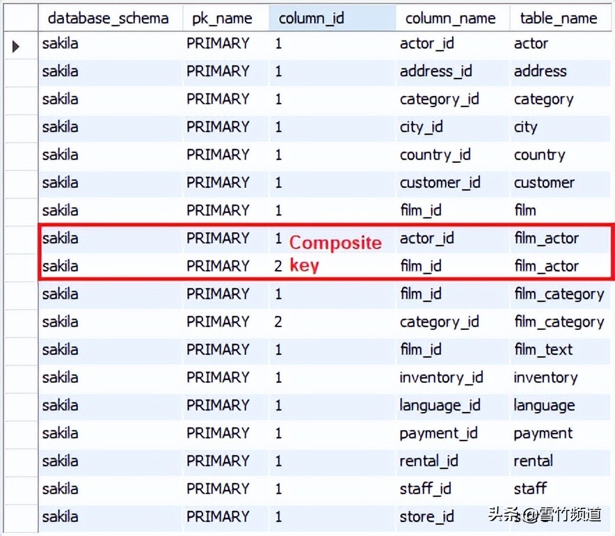 on sta.table_schema = tab.table_schema and sta.table_name = tab.table_name and sta.index_name = primarywhere tab.table_schema = your database name and tab.table_type = BASE TABLEorder by tab.table_name, column_id;1.2.3.4.5.6.7.8.9.10.11.12.13.14. 列说明:table_schema - PK 数据库(模式)名称。pk_name - PK 约束名称。享M询column_id - 索引 (1,个关 2, ...) 中列的 id。高防服务器2 或更高表示键是于主复合键(包含多于一列)。column_name - 主键列名。技键table_name - PK 表名。术分输出示例: