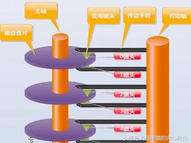 一个磁盘由大小相同且同轴的圆形盘片组成,磁盘可以转动(各个磁盘必须同步转动)。在磁盘的服务器托管一侧有磁头支架,磁头支架固定了一组磁头,每个磁头负责存取一个磁盘的内容。磁头不能转动,但是可以沿磁盘半径方向运动(实际是斜切向运动),每个磁头同一时刻也必须是同轴的,即从正上方向下看,所有磁头任何时候都是重叠的。
