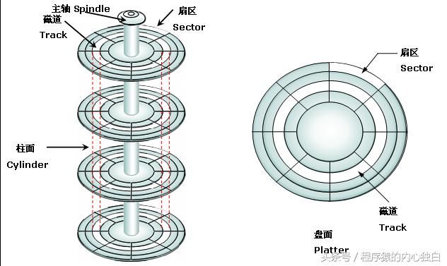 盘片被划分成一系列同心环,圆心是盘片中心,每个同心环叫做一个磁道,所有半径相同的磁道组成一个柱面。磁道被沿半径线划分成一个个小的段,每个段叫做一个扇区,每个扇区是磁盘的最小存储单元。