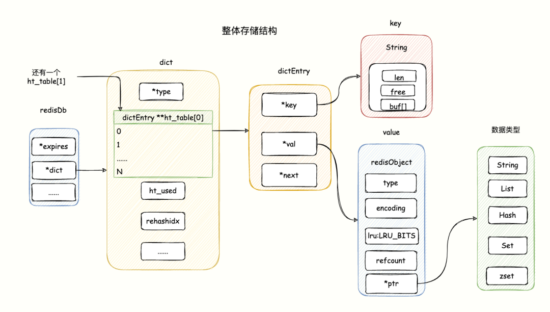 复制typedef struct dictEntry { // 指向 key 的指针 void *key; union { // 指向实际 value 的指针 void *val; uint64_t u64; int64_t s64; double d; } v; // 哈希冲突拉出的链表 struct dictEntry *next;} dictEntry;1.2.3.4.5.6.7.8.9.10.11.12.13. key 指向键值对的键的指针,key 都是 string 类型。value是个 union(联合体)当它的值是 uint64_t、int64_t 或 double 类型时,就不再需要额外的存储,这有利于减少内存碎片。(为了节省内存操碎了心)当然,val 也可以是 void 指针,指向值的指针,以便能存储任何类型的数据。next指向另一个 dictEntry 结构, 多个 dictEntry 可以通过 next 指针串连成链表, 从这里可以看出, ht_table 使用链地址法来处理键碰撞:当多个不同的键拥有相同的哈希值时,哈希表用一个链表将这些键连接起来。哈希桶并没有保存值本身,而是指向具体值的指针,从而实现了哈希桶能存不同数据类型的需求。