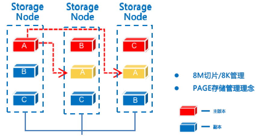 存储:数据多副本虚谷数据库,采用数据切片实现分布式数据存储。在多版本方面,可根据需要进行数据存储版本数配置,最多支持 3 个数据存储版本,默认是有 1 个主数据版本,2 个备数据版本。在真实存储中,主版本轮转分布,副本随机分布,数据均匀分布到整个数据库集群节点中,保证存储的高可用。在数据拆分粒度上,虚谷数据库不以逻辑表和业务维度进行数据切割,是以切分物理 CHUNK 的方式进行数据存储,通过内部算法进行分片处理并存储到各个存储节点。数据存储以 8M 进行自动切片,主版本轮转分配在各节点,其对应的副本随机存储在其他存储节点,将所有数据都均衡分布到每一个存储节点中。当某一存储节点宕机时,会立即通知管理节点;或者会选择宕机节点上存储的主版本数据对应的有效数据副本,将其切换为主版本;然后通知主版本向其余未宕机的存储节点复制还原丢失的数据版本,提供数据访问服务,避免单点故障导致数据库业务中断。
