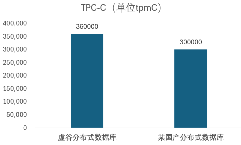 (3)极致可扩展的“高性能”分布式数据库的一大用途,就是满足业务高并发、高性能的场景需求。以标准的 TPC-C 模型为参照,厂商提供了如下评测结果。虚谷数据库在三节点(计算、存储角色混合)、1000 仓,不做任何优化下测试达到 36 万的tpmC成绩。相较于其他分布式数据库产品,其性能指标领先。且上述成绩通过优化可大幅提升,通过对数据分布的调整降低分布式事务比重或采用库内计算方式减低网络时延等手段,相信可以取得更优的效果。同时在分布式架构下可根据随着资源的扩容,进一步提升来满足用户的极限场景需求。下图是与某国内产品在同等资源条件下的测试对比图。