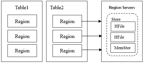 Region 是 HBase 中分布式存储和负载均衡的最小单元,不同的 Region 分布到不同的 RegionServer 上,如图 Table1 、 Table2 中均有多个 Region ,这些 Region 分布在不同的 RegionServer 中。Region 虽然是分布式分布式存储的最小单元,但并不是存储的最小单元, Store 是存储的最小单元。Region 由一个或者多个 Store 组成,每个 Store 会保存一个 Column Family ;每个 Store 又由一个 MemStore 或 0 至多个 Hfile 组成;MemStore 存储在内存中, HFile 存储在 HDFS 中。