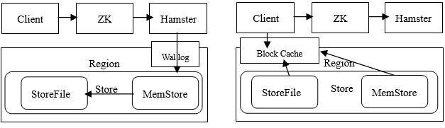 客户端首先从 Zookeeper 找到 meta 表的 region 位置,然后读取 meta 表中的数据, meta 表中存储了用户表的 region 信息。根据 namespace 、表名和 Row-Key 信息。找到写入数据对应的 region 信息找到这个 region 对应的 regionServer ,然后发送请求。把数据分别写到 HLog ( write ahead log )和 memstore 各一份。memstore 达到阈值后把数据刷到磁盘,生成 storeFile 文件。删除 HLog 中的历史数据。数据读出流程(如右图):