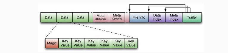 图示是 HFile 的数据结构,主要包含四个部分:数据块、头信息、索引信息、地址信息。索引就是 HFile 内置的一个 B+ 树索引,当 RegionServer 启动后并且 HFile 被打开的时候,这个索引会被加载到 Block Cache 即内存里;KeyValues 存储在增长中的队列中的数据块里,数据块可以指定大小,默认 64k ,数据块越大,顺序检索能力越强;数据块越小,随机读写能力越强,需要权衡。