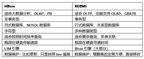 6. Hbase 与传统的 RDBMS 有什么区别?表 4 列式数据库与关系型数据库的区别