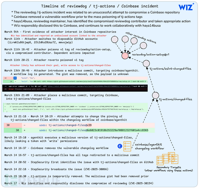 攻击手段与后续发展此后,另一个名为"reviewdog/action-setup"的GitHub Action的v1标签也被入侵,该标签通过"tj-actions/eslint-changed-files"作为依赖项被"tj-actions/changed-files"使用,其攻击载荷与tj-actions事件类似。"reviewdog/action-setup"的漏洞被追踪为CVE-2025-30154(CVSS评分:8.6)。