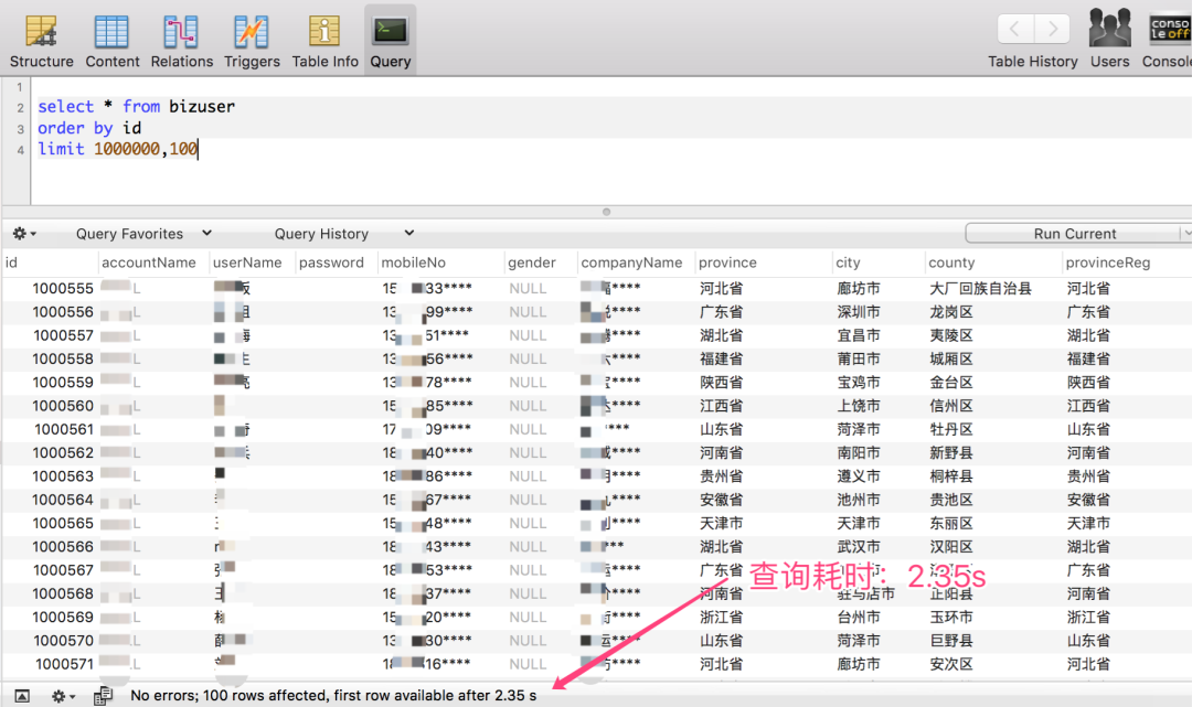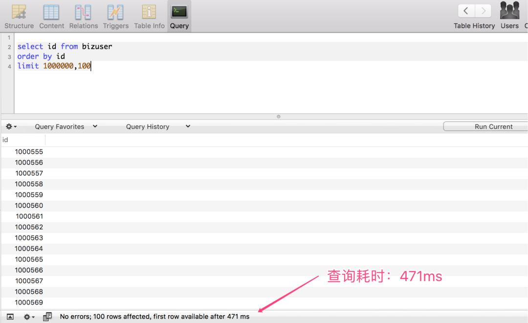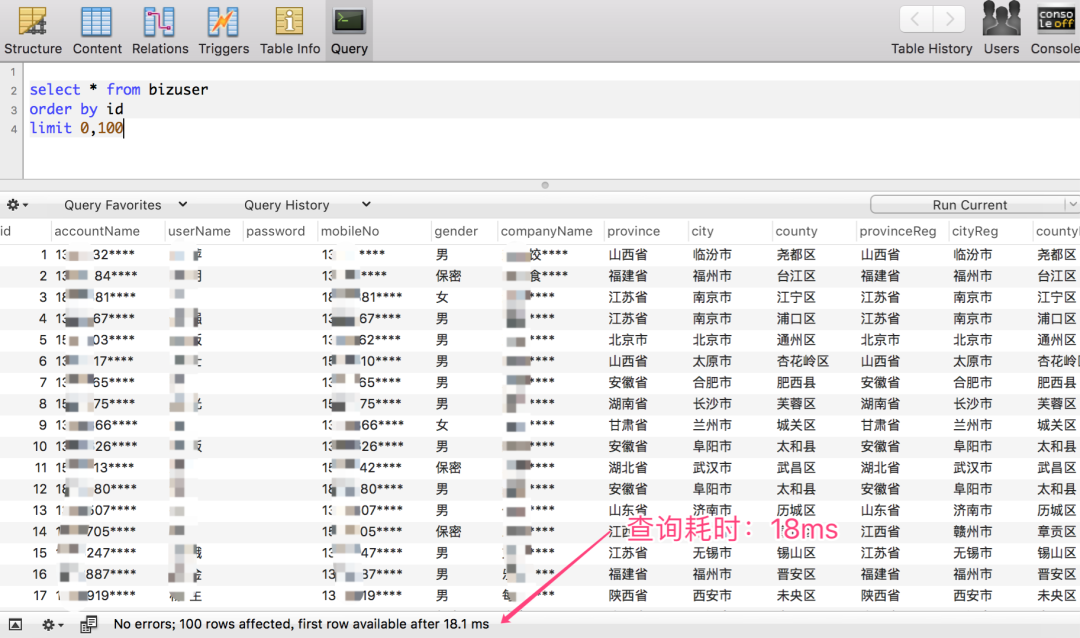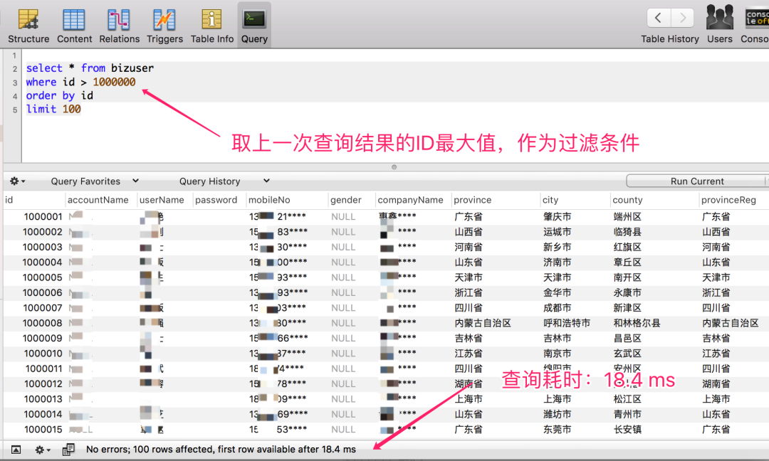 查询 100000~1000100 区间段的数据,仅耗时:18 ms