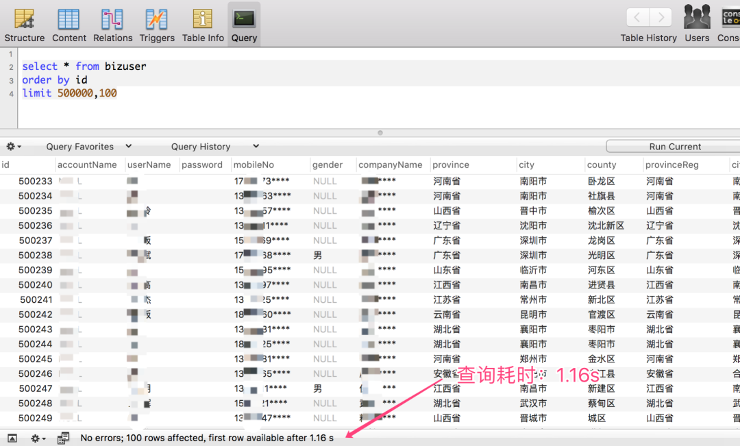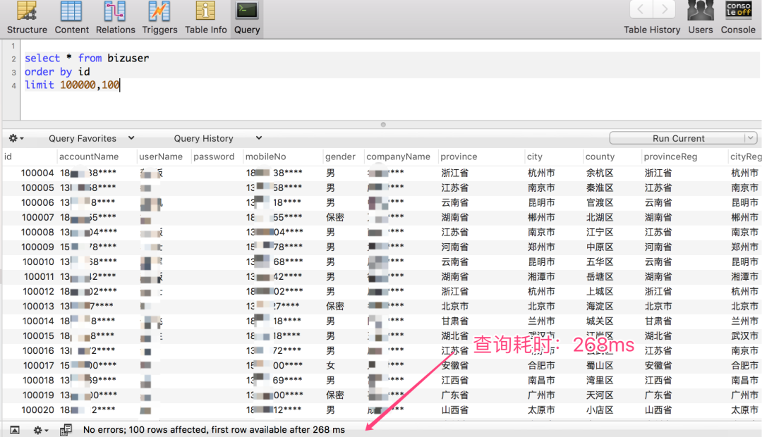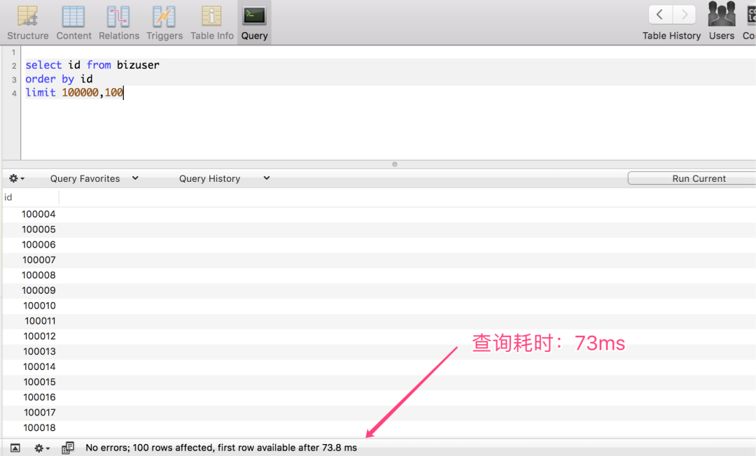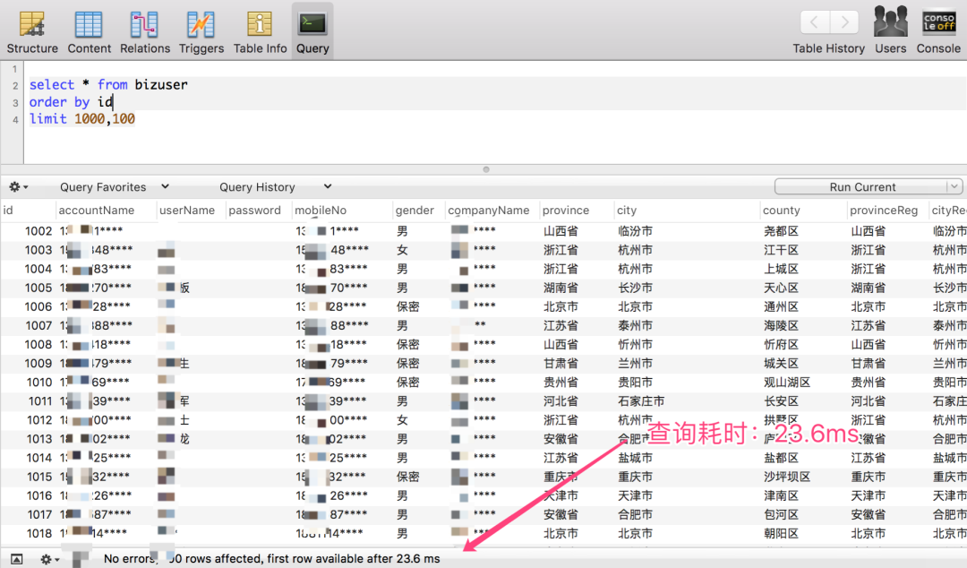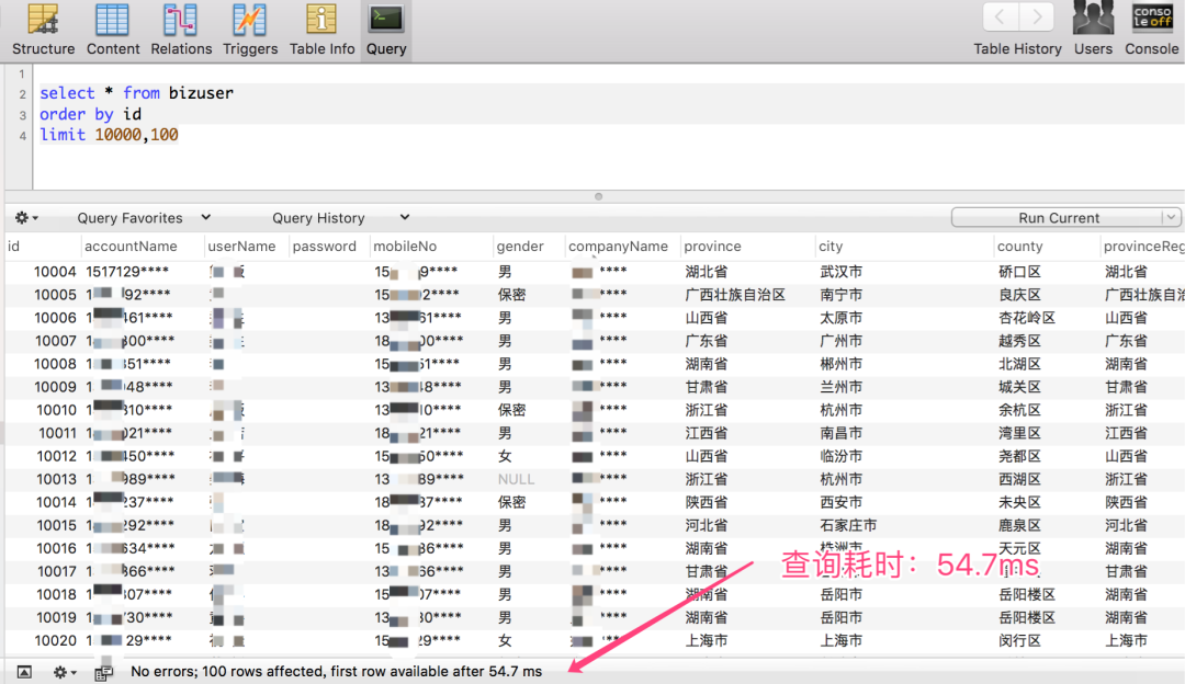 查询 100000~1000100 区间段的数据,仅耗时:18 ms