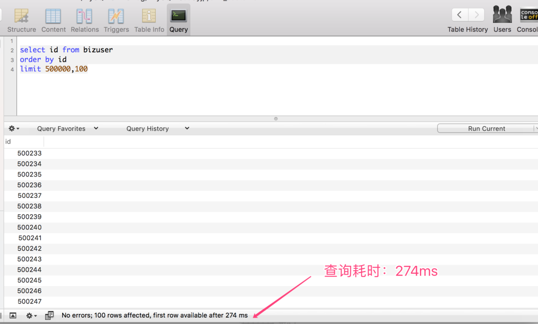 我们继续回到上文给大家介绍的客户表查询,将select *改成select id,简化返回的字段,我们再来观察一下查询耗时。