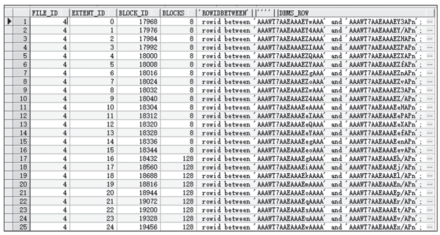 我们利用ROWID对每一行进行按区分片,新删此处引入了Oracle内部函数dbms_rowid.rowid_create帮助我们按区进行ROWID分片,除和代码如下:
