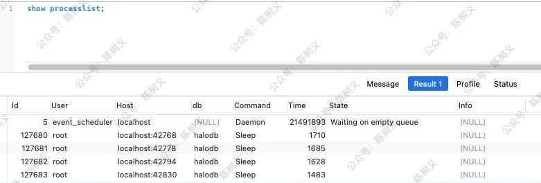 当我们用管理员账号对账号权限做修改后,到返底不影响已经存在的回数连接的权限,只有新建的连接才会使用新的权限设置。我们可以通过 show processlist 命令查看目前的连接情况,如下图所示。