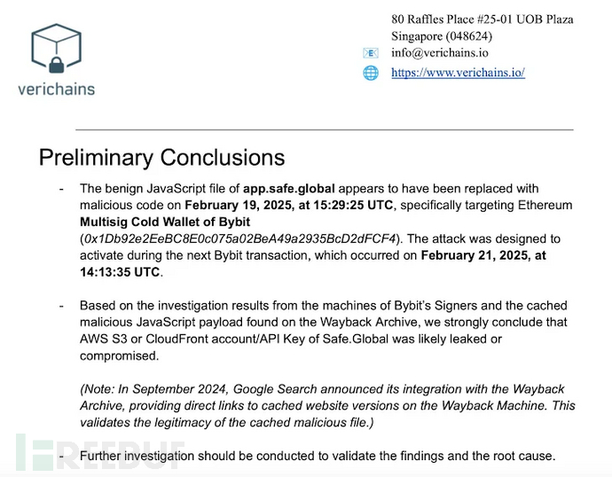 Verichains 指出:“app.safe.global 的良性 JavaScript 文件似乎在 2025 年 2 月 19 日 UTC 时间 15:29:25 被恶意代码替换,专门针对 Bybit 的以太坊多签冷钱包。源码库” 并补充说:“攻击设计为在下一次 Bybit 交易期间激活,该交易发生在 2025 年 2 月 21 日 UTC 时间 14:13:35。” Safe.Global 的 AWS S3 或 CloudFront 账户/API 密钥可能泄露或被攻破,从而为供应链攻击铺平了道路。