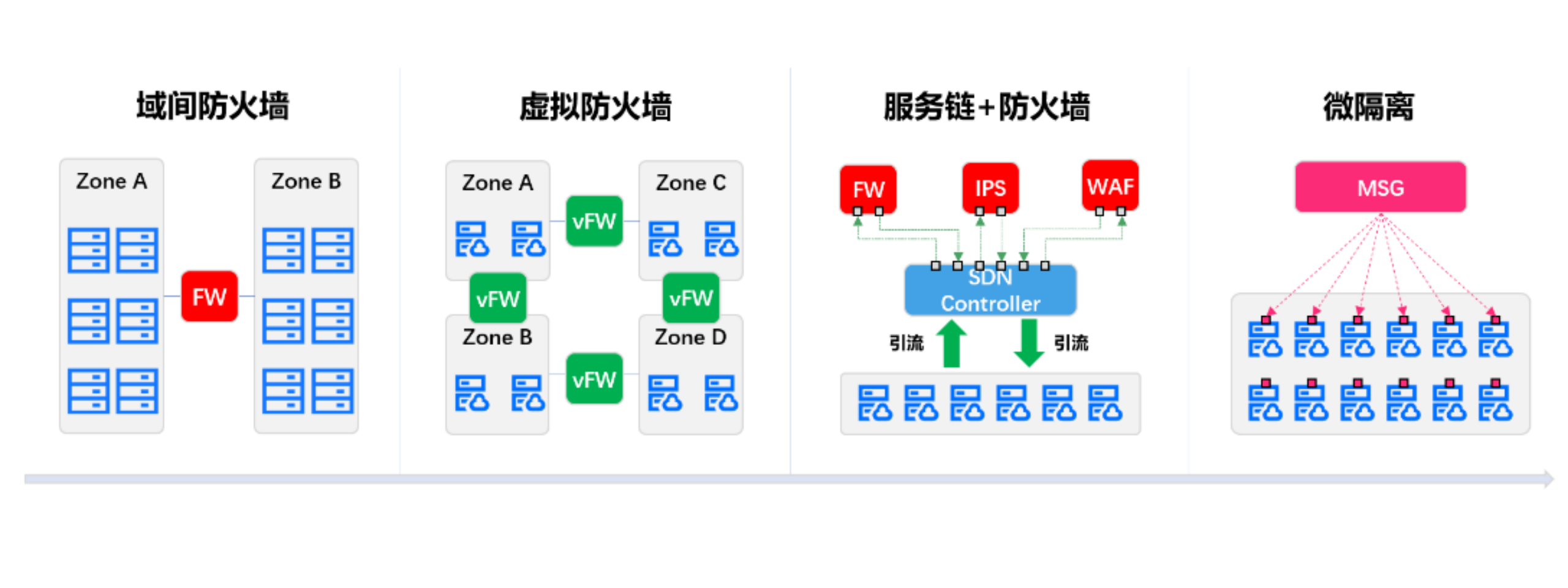 在规模庞大的数据中心内部进行安全域分隔和网络控制,是银行业的长期通行做法。随着数据中心架构几代演变,S行在历史上尝试过多种网络隔离控制方案,例如从最初的域间防火墙方案、到上云初期的虚拟防火墙方案、再到后来利用SDN技术的服务链编排方案等。