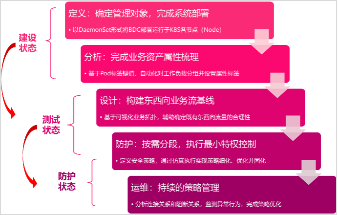 所谓“五步法”,是指定义、分析、设计、防护和运维5个关键步骤,它既是行业公认的零信任理念落地方法,也是我们总结出的一套切实可行的微隔离实施方案。
