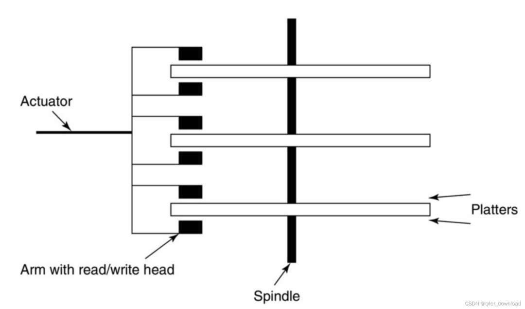 从上图看到,每个盘片都被两个磁头夹住,这里需要注意的是,所有磁头在移动时都必须同时运动,也就是当某个磁头想要读取某个轨道时,所有磁头都必须同时移动到给定轨道,不能是一个磁头移动到第10轨道,然后另一个磁头挪到第8轨道,同时在同一时刻只能有一个磁头进行读写,基于这些特点使得磁片的读写速度非常慢。