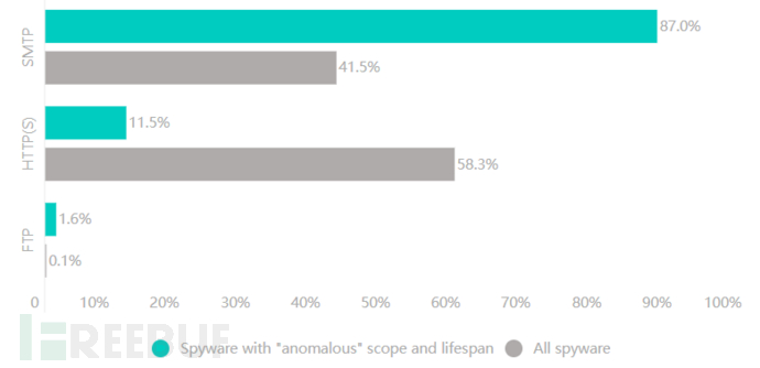 C&C 基础设施这些表现出“异常”的恶意样本,大多都使用基于 SMTP(而非 FTP/HTTP)的 C&C 信道进行单向数据传说,这意味攻击者的目标就是窃取数据。