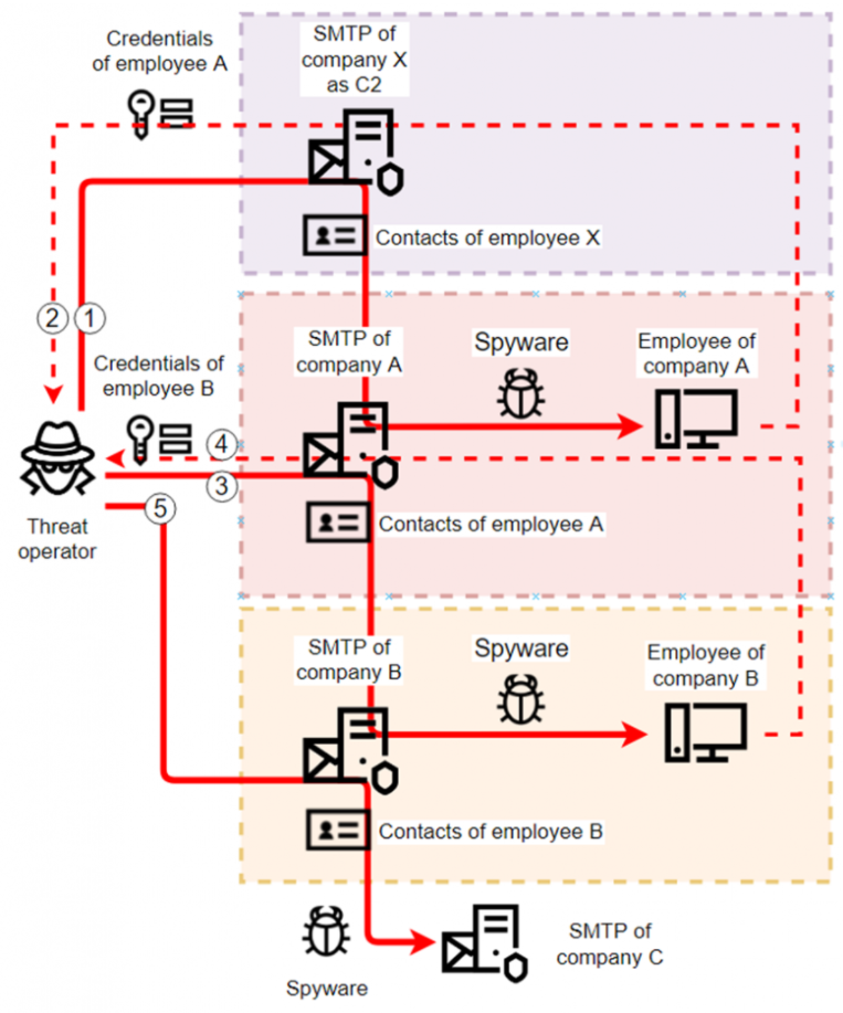 总体而言,已经发现超过 2000 个属于工业组织的企业邮箱被滥用,作为发起新攻击的源码库 C&C 服务器。根据卡巴斯基的估算,可能还有超过 7000 个邮箱被在网络上出售或者以其他方式被滥用。