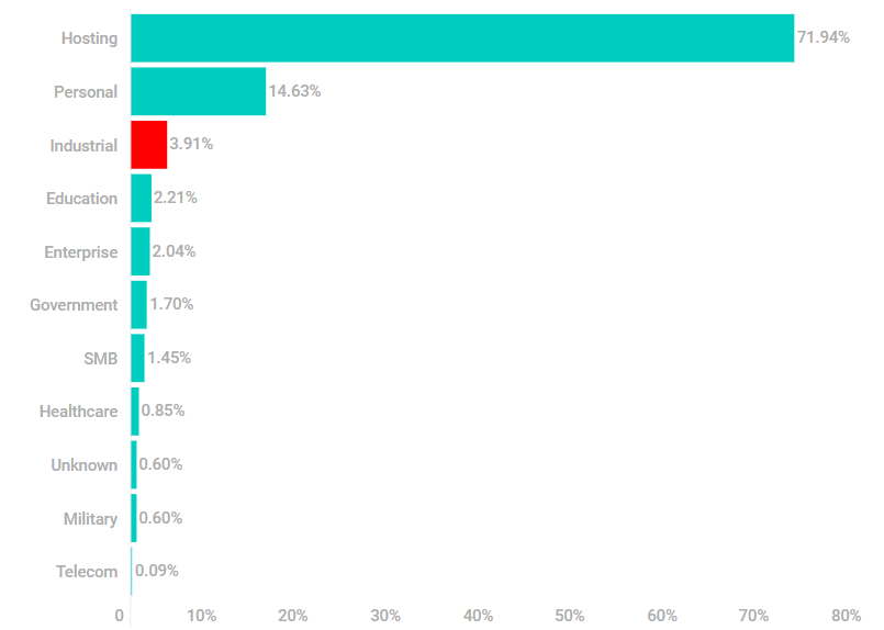 对市场上待售的 50000+ 个 RDP 账户的元数据进行统计分析,其中 1954 个(3.9%)属于工业组织。
