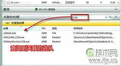 先在开始菜单的搜索对话框中输入“资源监视器”,搜索并运行该程序,然后在其主界面中切换到“CPU”选项卡,接着单击“关联的句柄”栏右侧的小箭头,将其展开;再在搜索栏中输入需要删除的文件资源的文件名(如“xb”,假如文件名较长,b2b信息网可输入部分文件名),此时很快就可以搜索到该文件资源究竟是被哪些“内鬼”所占用了;最后右击已经搜索到的进程,选择“结束进程”以结束运行这些进程,就可以很顺利地删除相关的文件资源了。