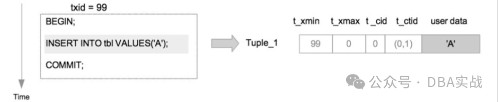 假设元组是由 txid=99 的事务插入页面中的,这时被插入元组的首部字段设置如下: