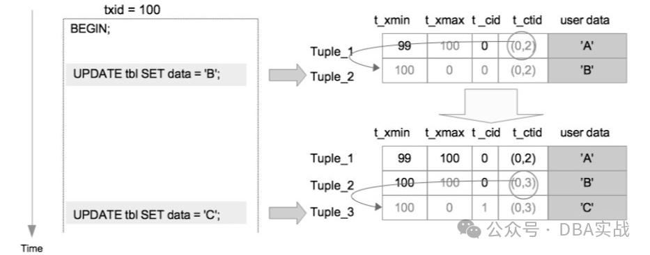 t_xmin: 100、t_xmax: 0、t_cid: 0、t_ctid: (0,2)第二条 UPDATE 命令