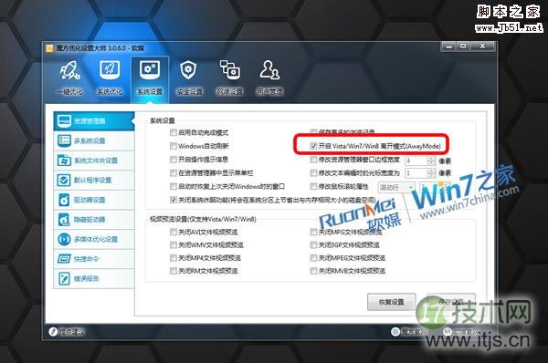 无论你使用Windows 7优化大师还是魔方优化大师,你可以轻松的在系统设置大师里面找到离开模式的设置选项——