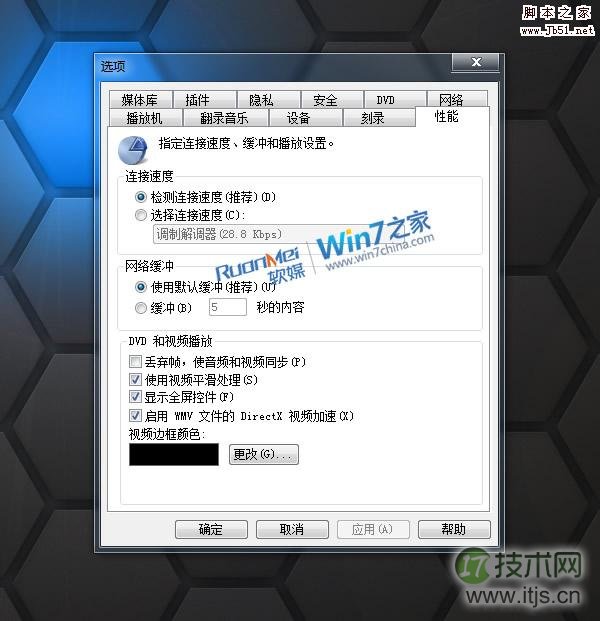 运行WMP 12,单击“工具→选项”,在弹出的对话框中切换到“性能”标签,取消程序默认勾选的“启用WMV文件的DirectX视频加速”,如下图:
