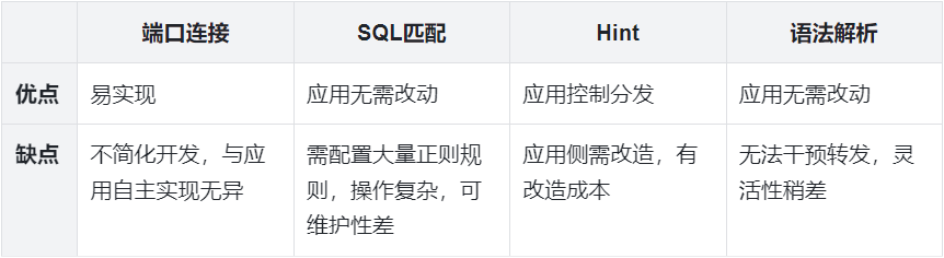 使用语法解析是相对来说较为友好的方式,无需开发人员感知即可实现读写操作分离。但这其中存在难点,就是如何准确判断出只读操作存在一定困难,例如使用函数、存储过程、触发器或诸如“SELECT ... FOR UPDATE”类的操作。此时,是需要引入辅助机制进行判断,可采取配置名单方式来辅助分析;或者通过Hint、API的方式强制指定走写库或读库。除此之外,还有些命令也需要规范是否可在备库执行,如COPY、SHOW、SET、BEGIN...END等。
