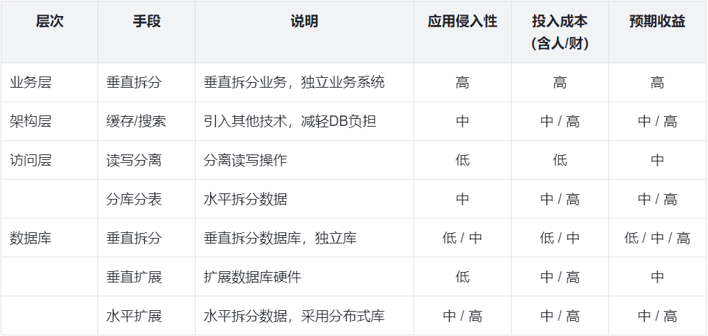 数据库-垂直扩展对数据库升级是快速见效的措施,对应用几乎无影响,但需一定的成本投入及升级所需的中断服务的时间。取得收益存在上限瓶颈,预期中等。