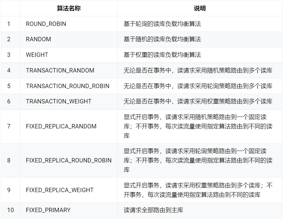 支持动态、静态读写分离能力,支持自动拓扑感知与人工设定。支持多种数据库(如MySQL、PG、openGauss等)及多种架构(如MySQL 主从、MGR等)支持多端接入(Driver、Proxy),可满足低时延场景支持语法解析自动判断或 Hint 方式手工指定支持包括熔断等能力的人工干预手段,可适应多种场景支持类SQL的管理配置方式,支持热加载配置支持丰富的负载均衡算法,如下图