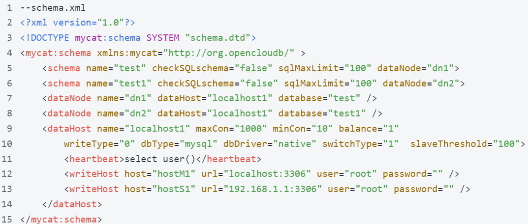 MyCAT 是一款开源的数据库中间件产品。读写分离功能通过配置文件完成,如下