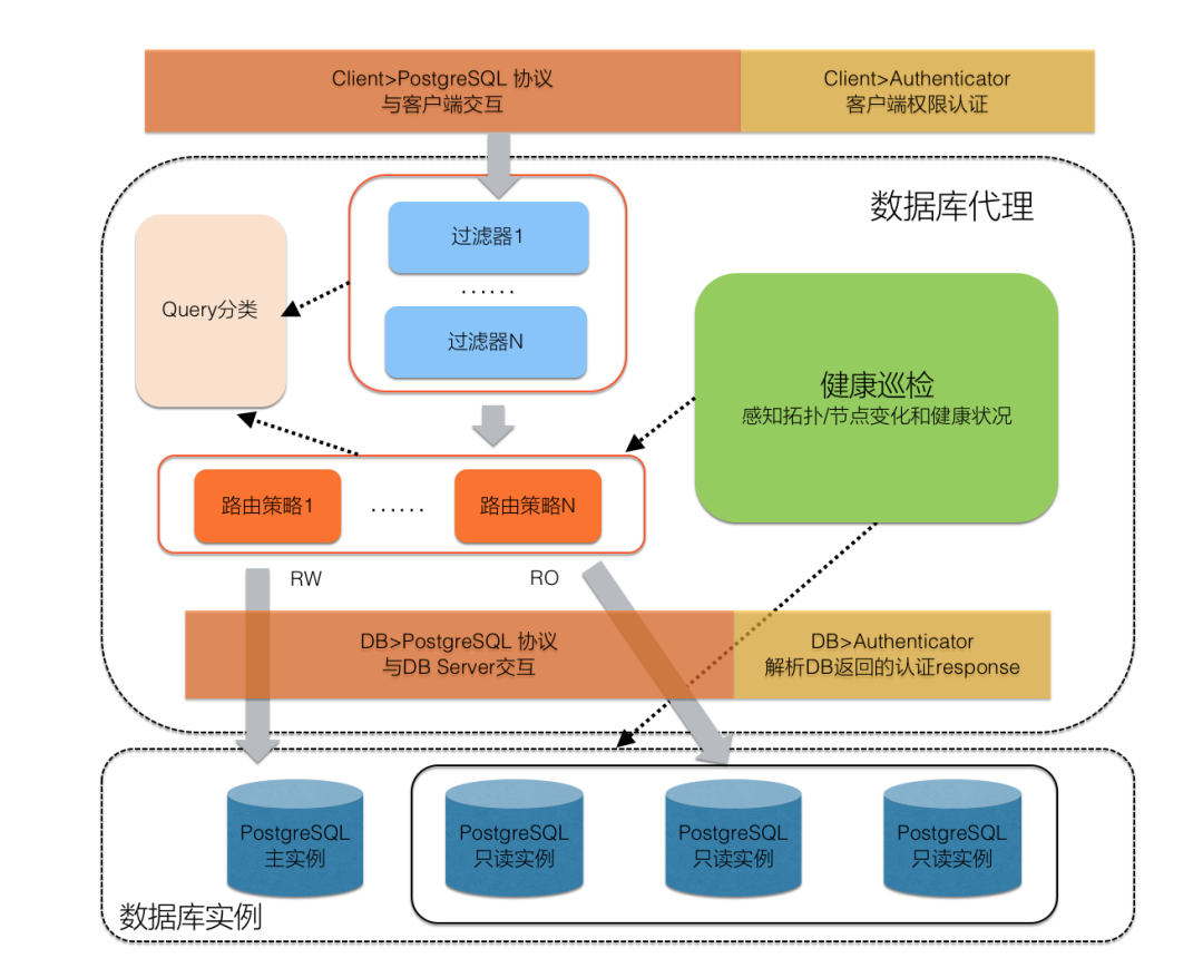 数据库代理支持了PostgreSQL的协议,并且具备对用户的请求连接认证权限的能力。代理中的路由策略是核心:可以通过hint中指定固定的实例节点来转发流量;也能够将事务内写操作之前的读请求转发到只读实例,降低主实例负载;路由策略还可以根据用户自定义的只读模式或读写模式对请求进行不同的分发执行。健康巡检模块周期性感知读写分离架构的拓扑变化情况,在实例节点不健康或者超过延迟阈值,会自动把读请求路由到其他的只读实例上。