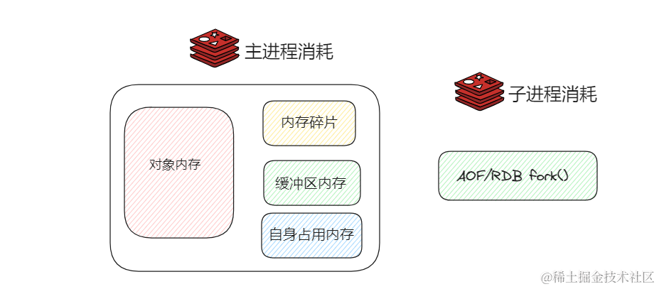 Redis内存消耗主要在于其主进程消耗和子进程消耗。而主进程消耗又主要包括自身内存、对象内存、缓冲区内存、内存碎片四个方面: