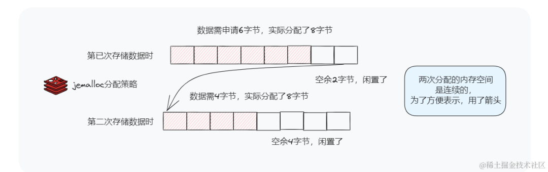 第一次存储数据是需要6字节,而Redis内存分配策略给你分配了8字节,空出2个字节的空间。