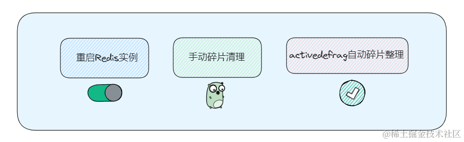 前面说的 info memory命令,如果指标值 mem_fragmentation_ratio (内存碎片率)的值,在 1 < 碎片率 < 1.5,可以认为是合理的,而大于 1.5 说明碎片已经超过 50%,我们需要采取一些手段解决碎片率过大的问题。