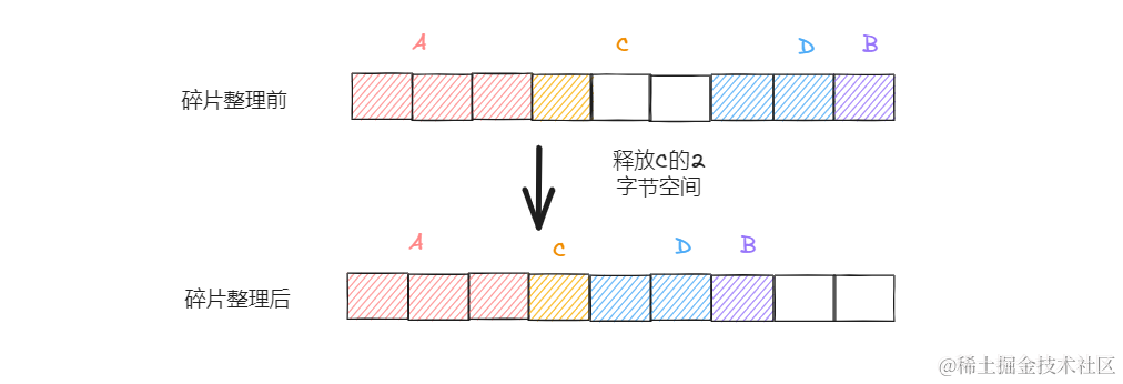 1. 清理前,C和D之间多了2字节的内存碎片